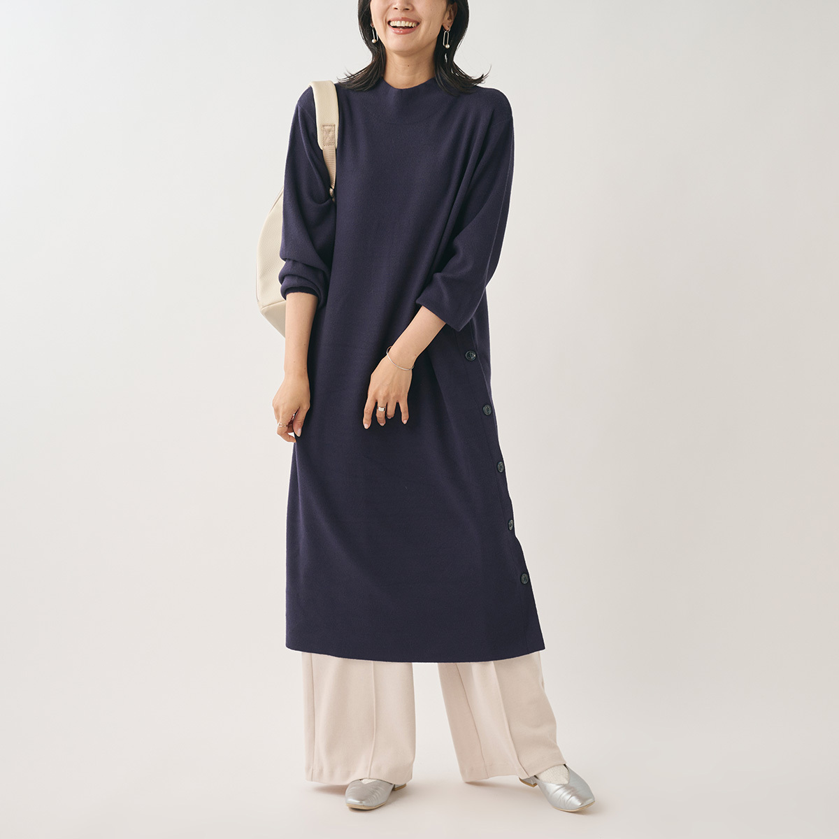 【サイドボタンがアクセント!1枚でスッキリ着こなす優秀ニットワンピース】