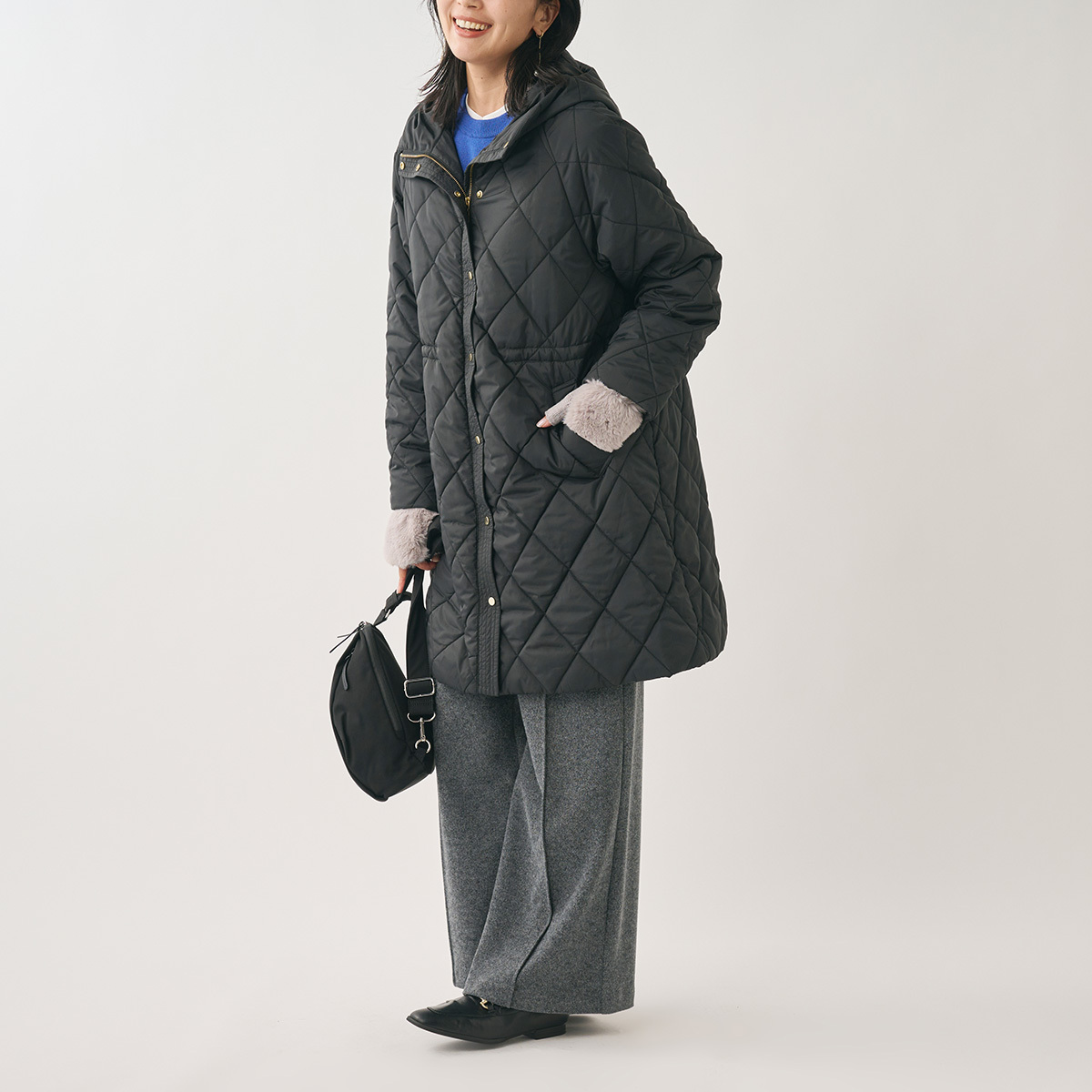 ロングコートはウエストのスピンドルでシルエット調整も♪